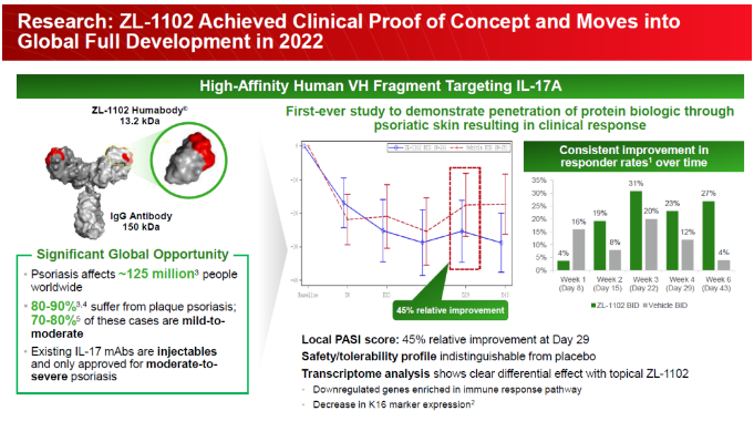 再鼎医药作为IL-17靶点的后来者,开发了单域抗体,顺利获得外用给药,被证明可以实现透皮肤的效果,对轻至中度银屑病取得很好的初步临床数据。